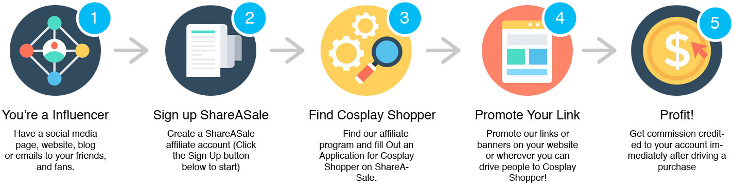 At Cosplay Shopper, we look for associates who are a value-add for our customers – if you’re a passionate cosplayer, reviewer, stylist, content creator or curator who would like to refer your audience to products on Cosplay Shopper, you may be the right fit. If you need more information, email us at info@cosplayshopper.com. When you become an Affiliate Advertising Partner with Cosplay Shopper you will receive a commission on all sales you refer to our site. Our Affiliate Program gives you the opportunity to earn money by referring your website visitors, friends, family or co-workers to our website. Cosplay Shopper has integrated ShareASale to provide you with the best affiliate experience on the web. Through ShareASale, you will be provided with a unique URL that will track anyone who clicks through to our site. Use your custom link on your website, personal blog, Facebook/Instagram profile or group or just send it out in e-mails to your friends. For every click that results in a sale, you receive a commission.
